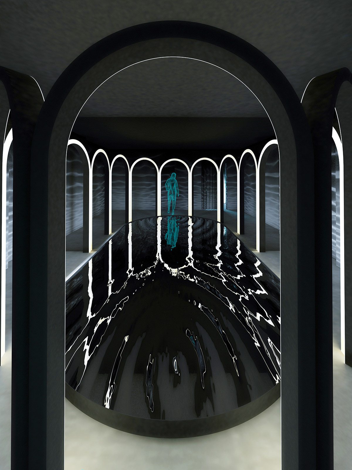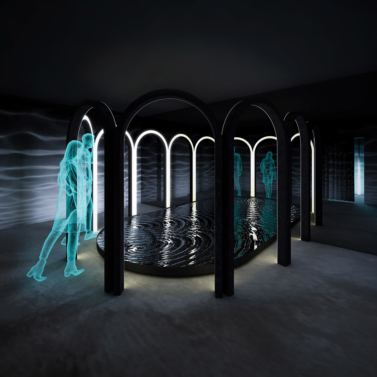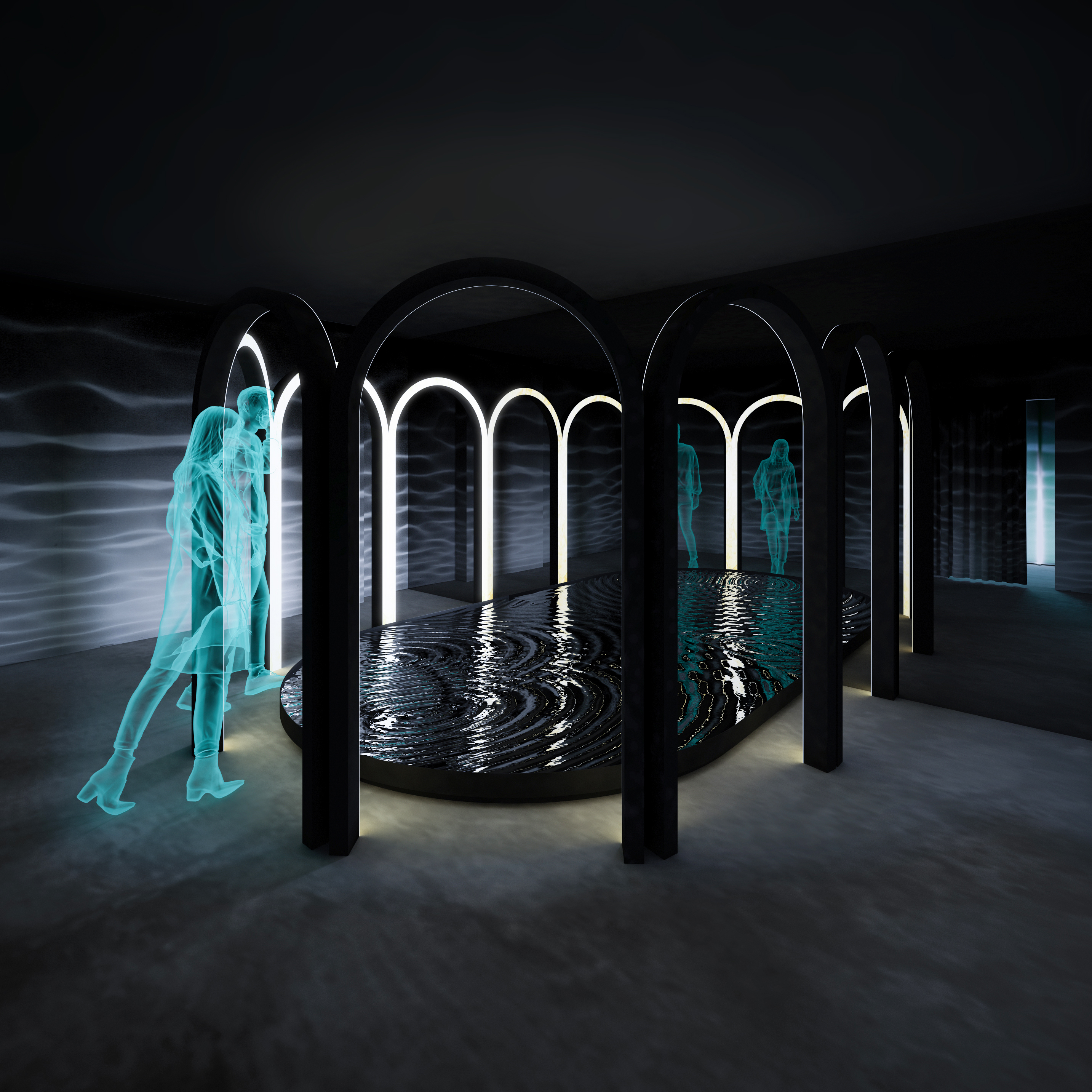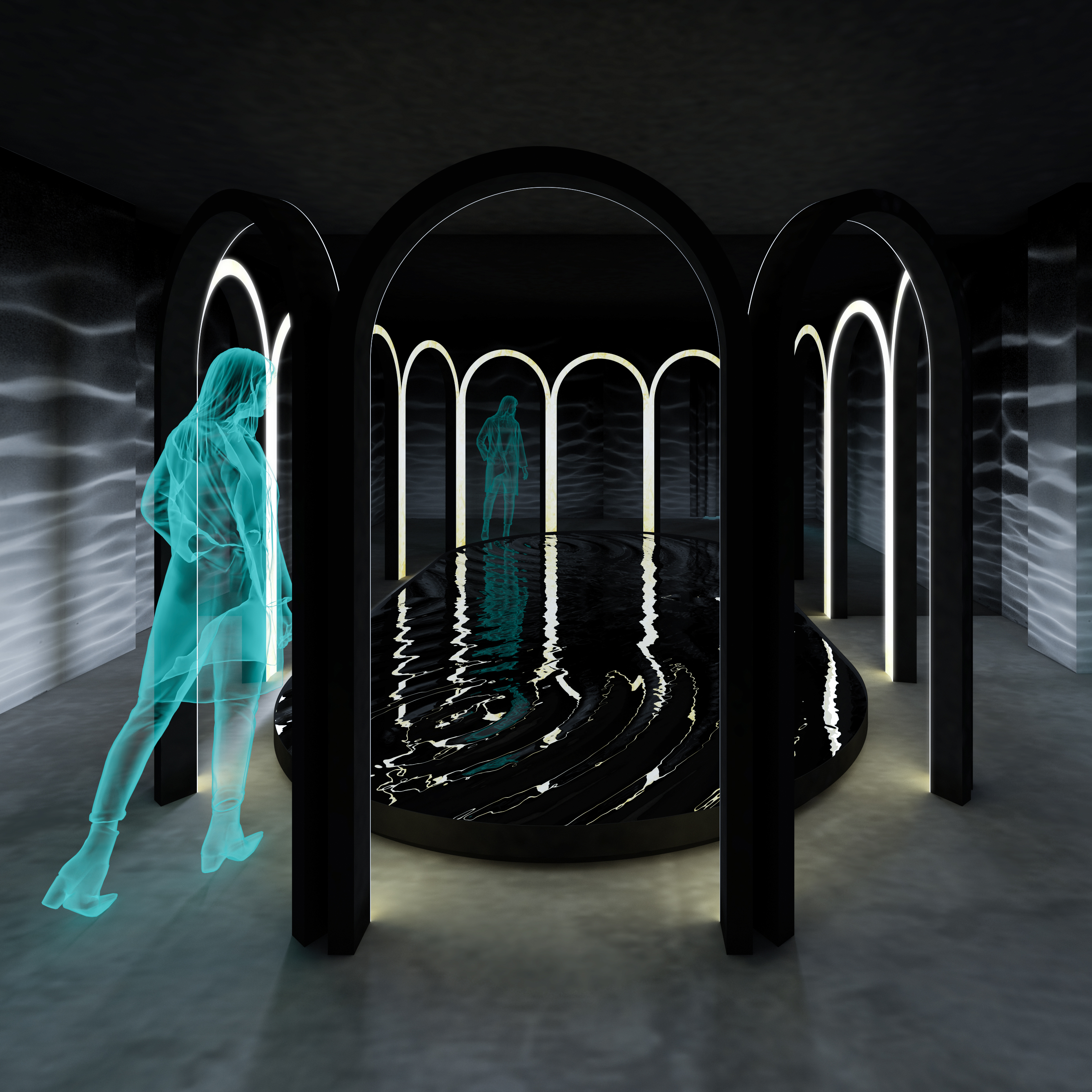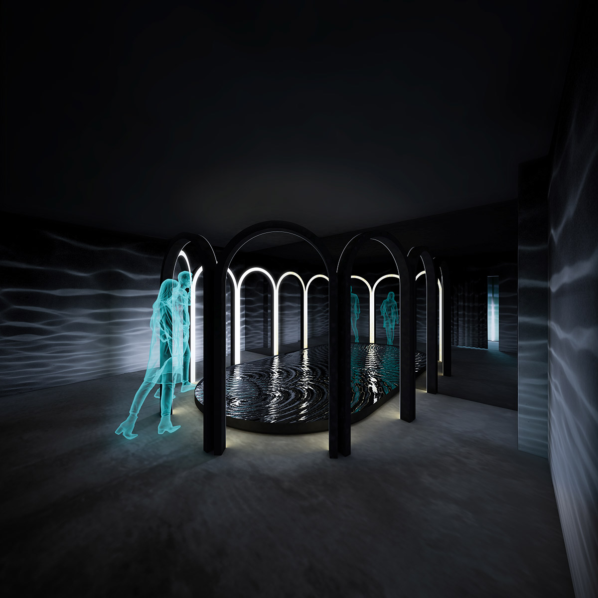 Prima cameră este despre “a auzi“. Prin senzori plasați în dreptul arcadelor, vizitatorul declanșează vibrația unui element care produce unde concentrice în apă. Reflexia undelor mișcătoare îmbracă întreg spațiul. Sub fiecare arcadă se aude un sunet diferit, declanșat în funcție de persoanele din camera 3.
