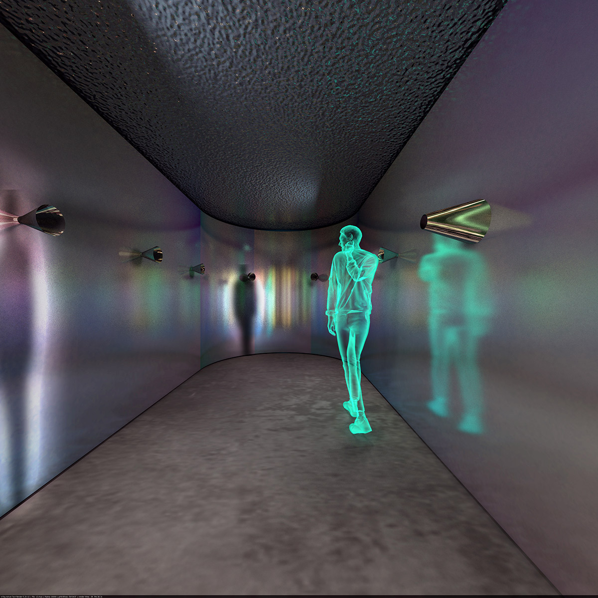 Scenografia amintește de un context urban esențializat, percepția asupra spațiului este augmentată prin reflexii și tehnologie.