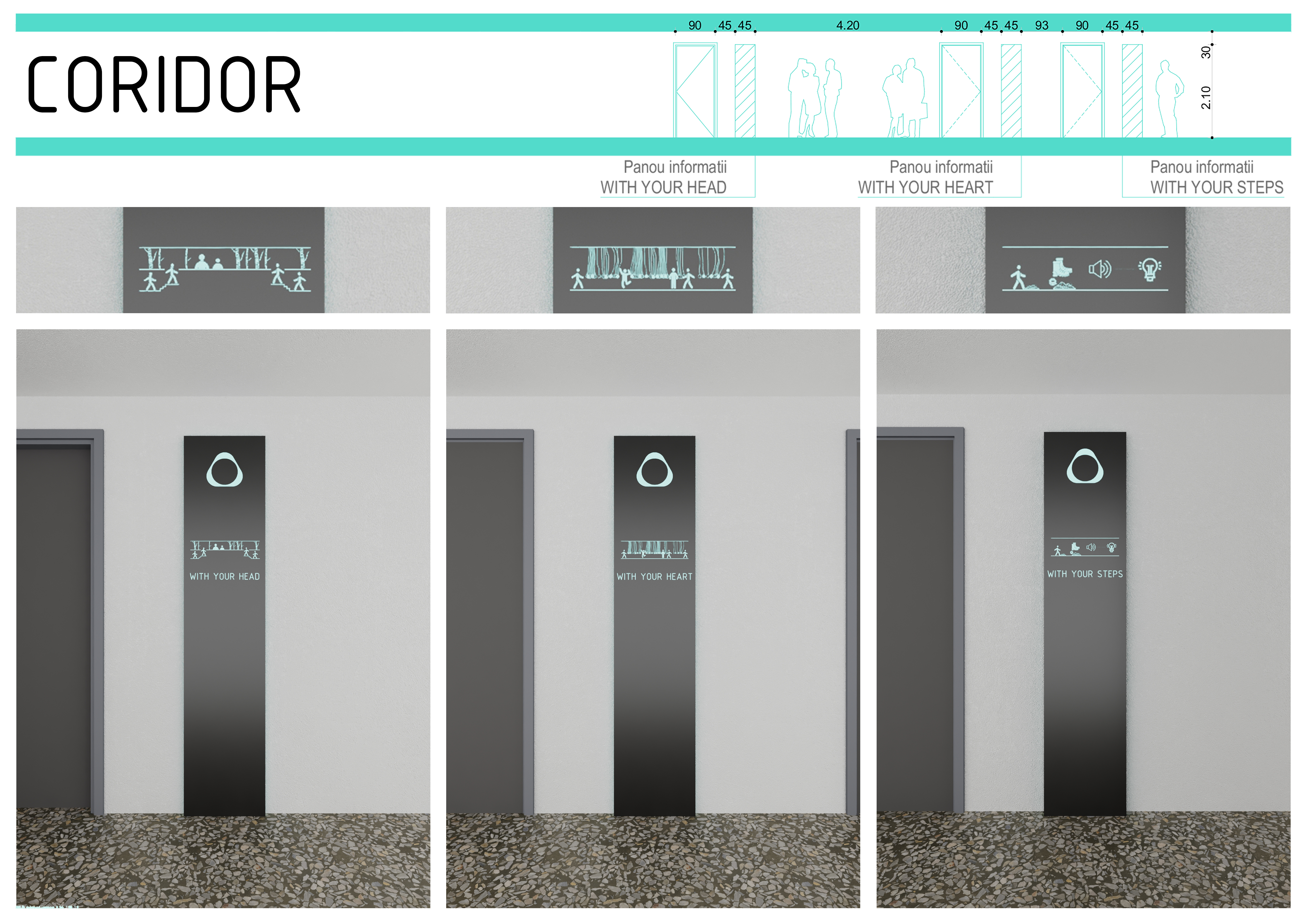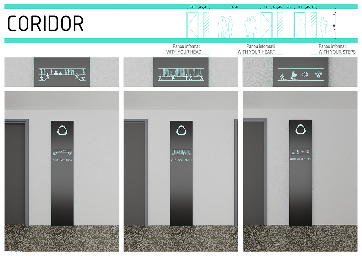 Atmosfera primei încăperi este apăsătoare la prima vedere, cu tavanul coborat la 2m înălțime și logo-ul ca unică sursă de lumină. Gradenele perimetrale aferente fantei din plafon invită la descoperirea spațiului ascuns în nișa tavanului. Reflectarea elementelor vegetale îndeamnă la o privire în profunzime până la vizitatorii din cealaltă parte a încăperii, asigurând contactul vizual.