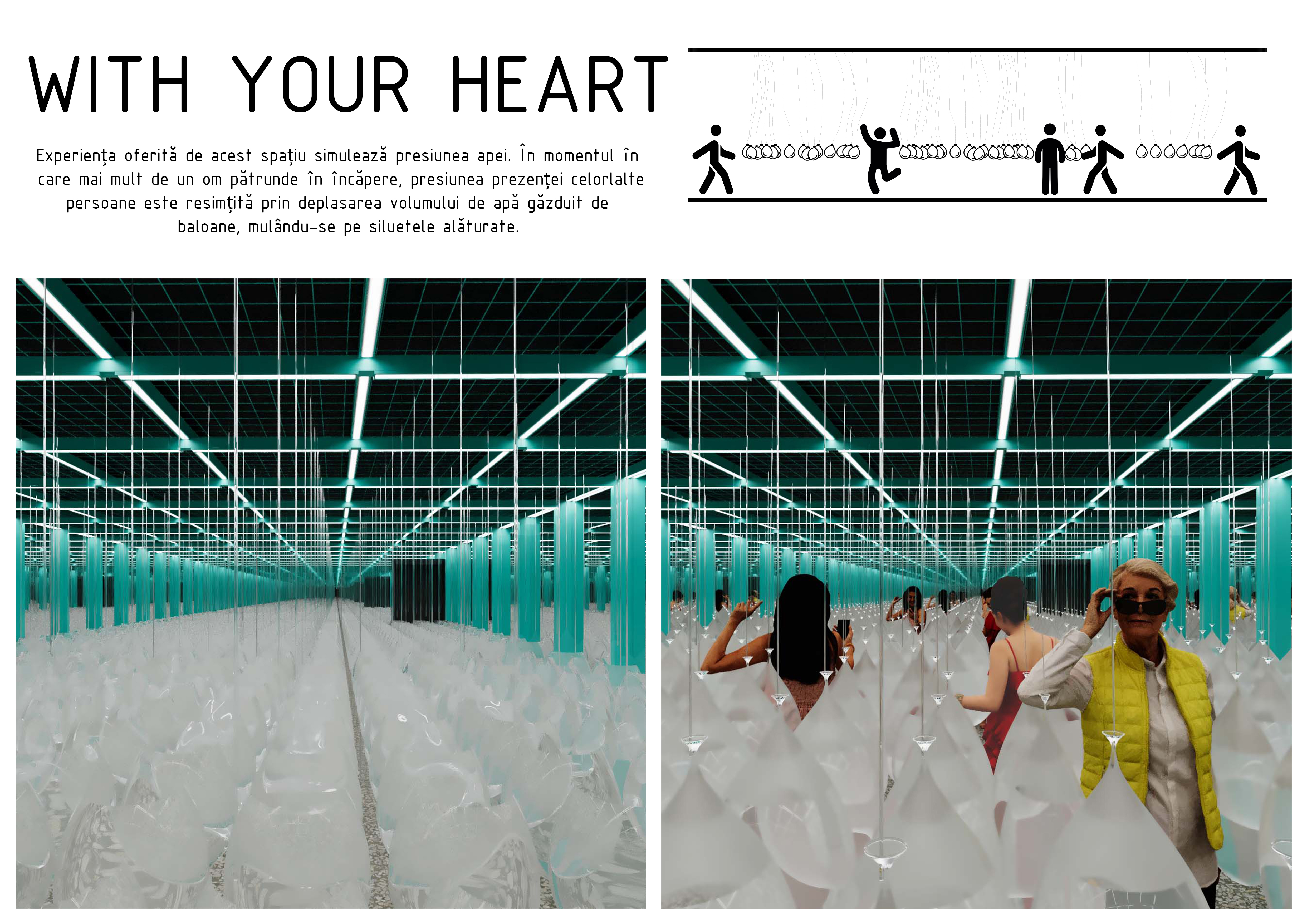 Percepția tactilă a spațiului este influențată de numărul de persoane prezente simultan în cameră și tipul de mișcări pe care aceștia le întreprind, deplasând volumul de apă găzduit de baloane și mulându-se pe pieptul siluetelor alăturate.