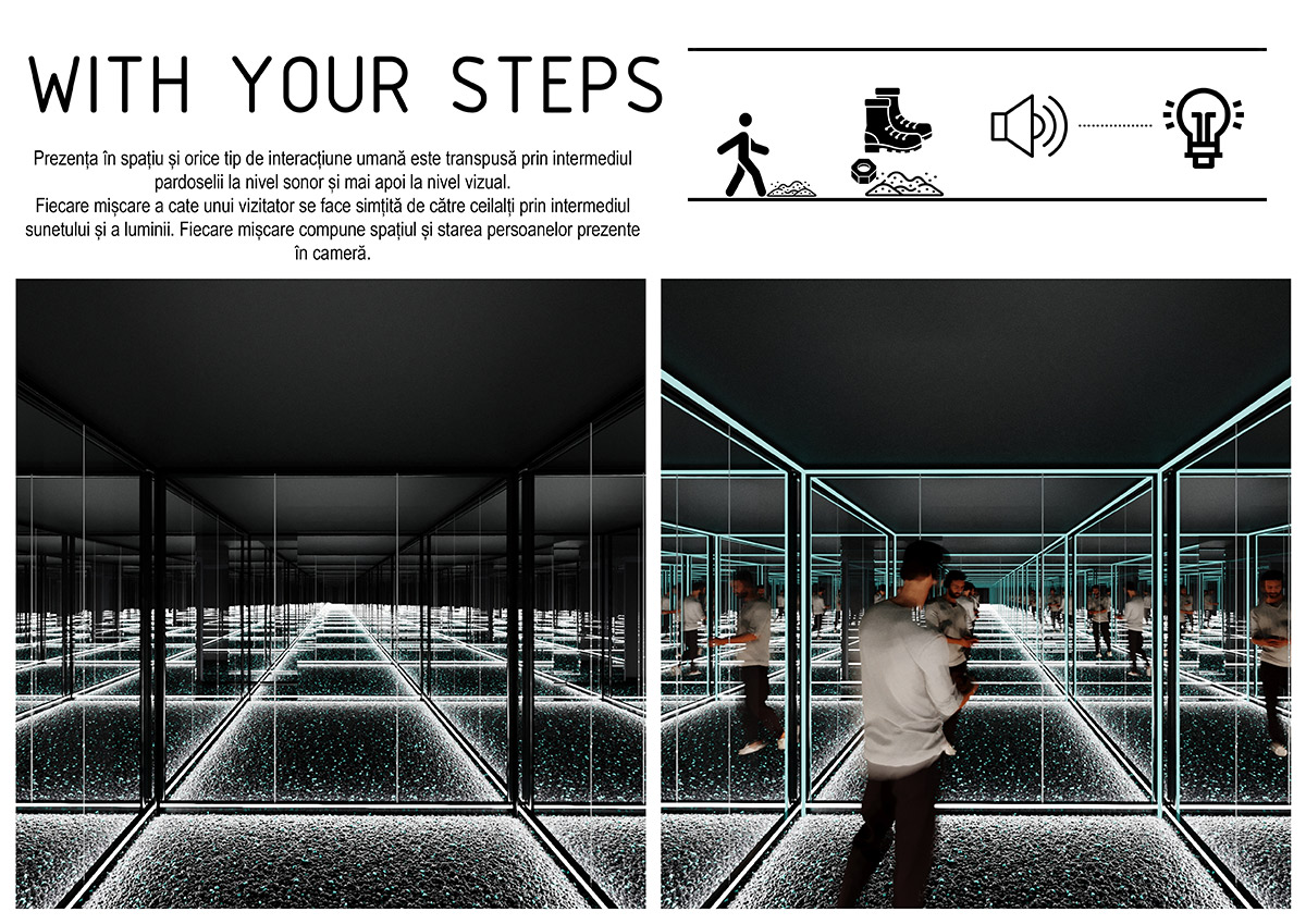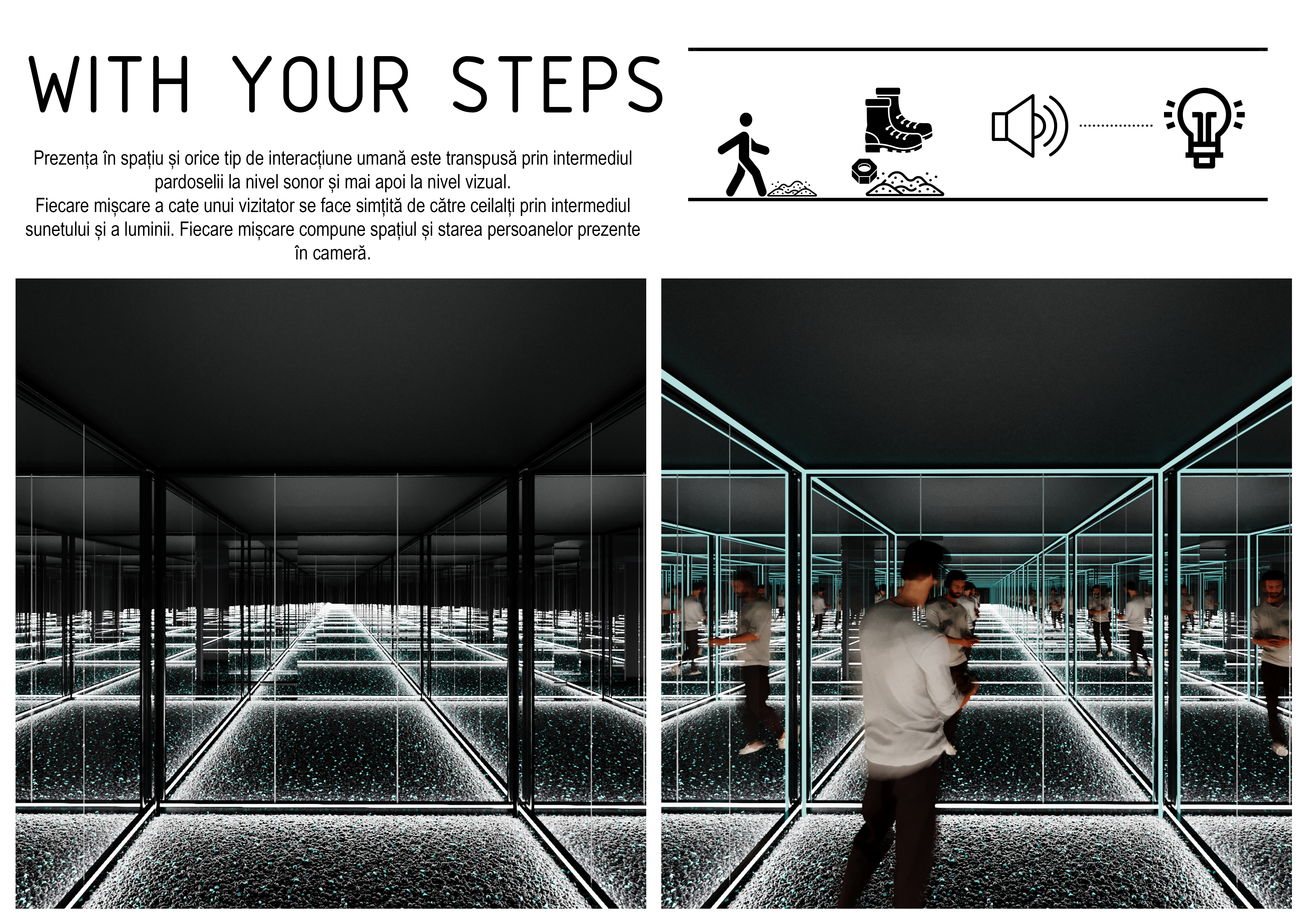 Prezența în spațiu și orice tip de interacțiune umană este transpusă prin intermediul pardoselii la nivel sonor și mai apoi la nivel vizual. Fiecare mișcare a cate unui vizitator se face simțită de către ceilalți prin intermediul sunetului și a luminii. Fiecare mișcare compune spațiul și starea persoanelor prezente în cameră, inițial printr-o manifestare sonoră, iar ulterior o semnalizare luminoasă, vizuală.